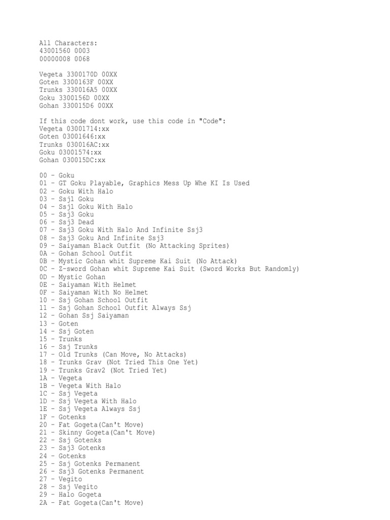 Character Modifiers See Note Extra Attacks. Buus Fury GameShark Codes Dragon Ball Z.